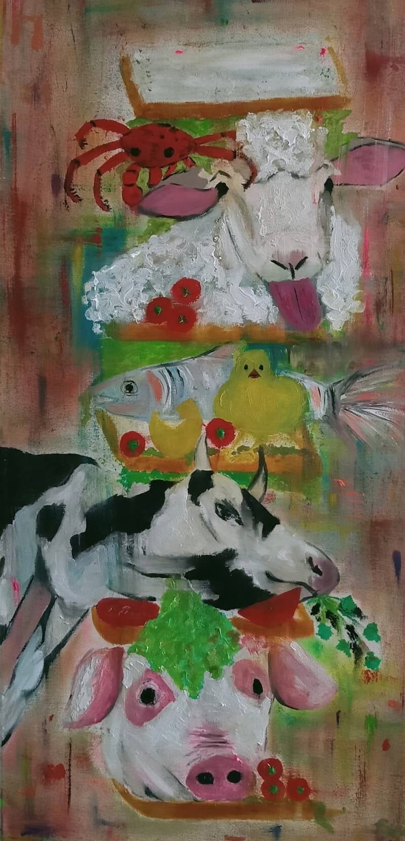Mutación.. En este lienzo se pretende representar la huella que deja el ser humano al experimentar con otras especies y manipular la genética de lo implícito por la madre naturaleza.